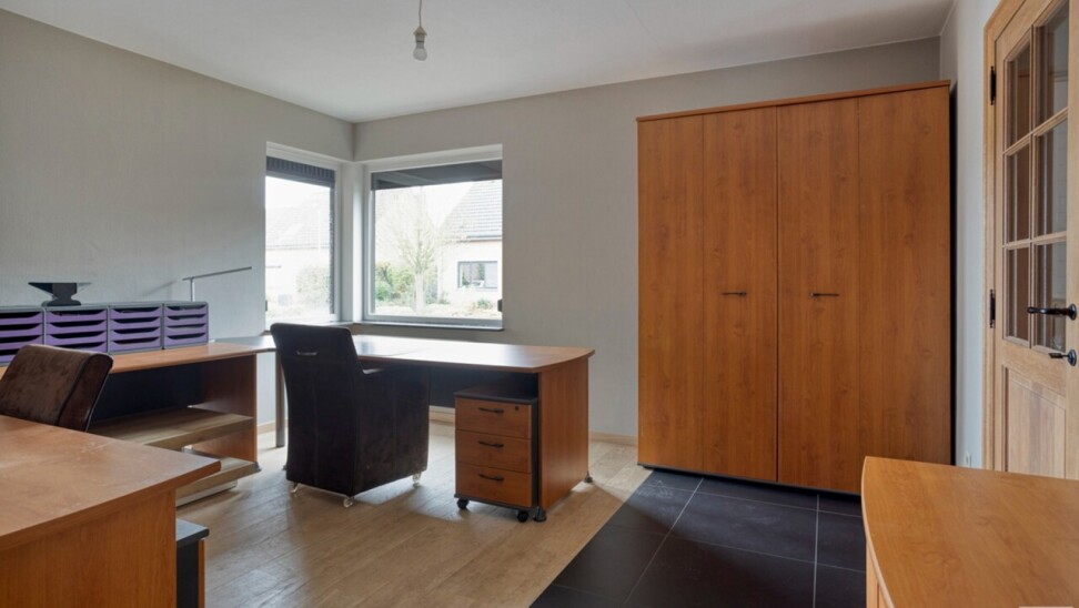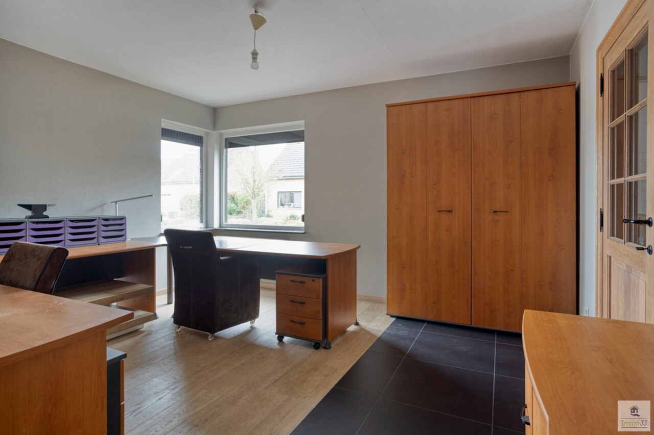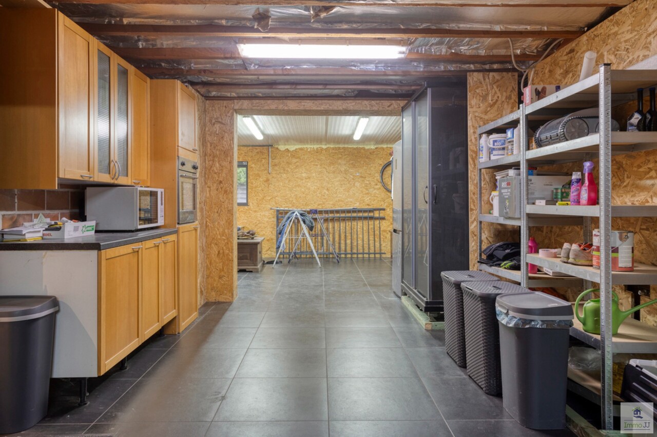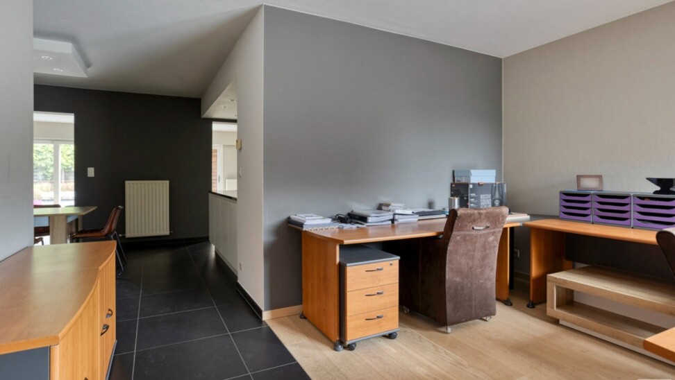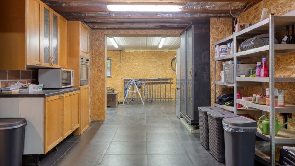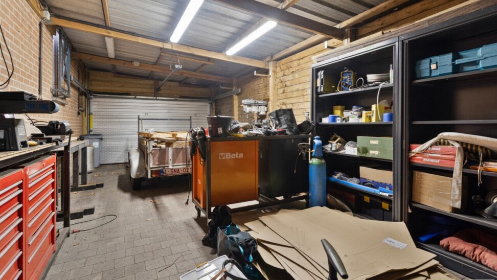 INDELING: Gelijkvloers: inkomhal met apart toilet, bureauruimte, living, eetplaats met open keuken. Garage met bergplaats en polyvalente ruimte met toegang tot terras en tuin. Werkplaats en garage. Poolhouse. Verdieping 1: nachthal met 3 slaapkamers en badkamer. Zolderruimte toegankelijk via grote slaapkamer en mogelijks om te vormen tot 2e badkamer/dressingruimte.