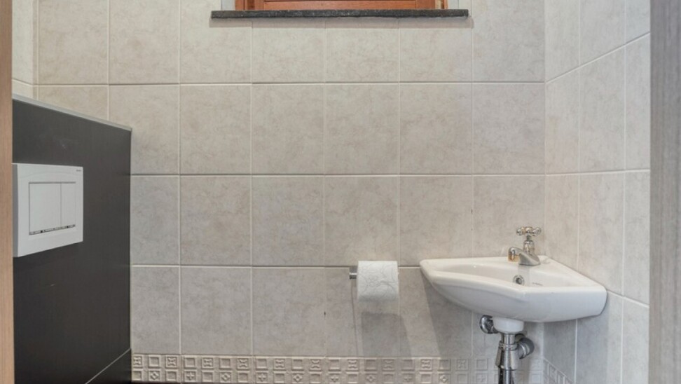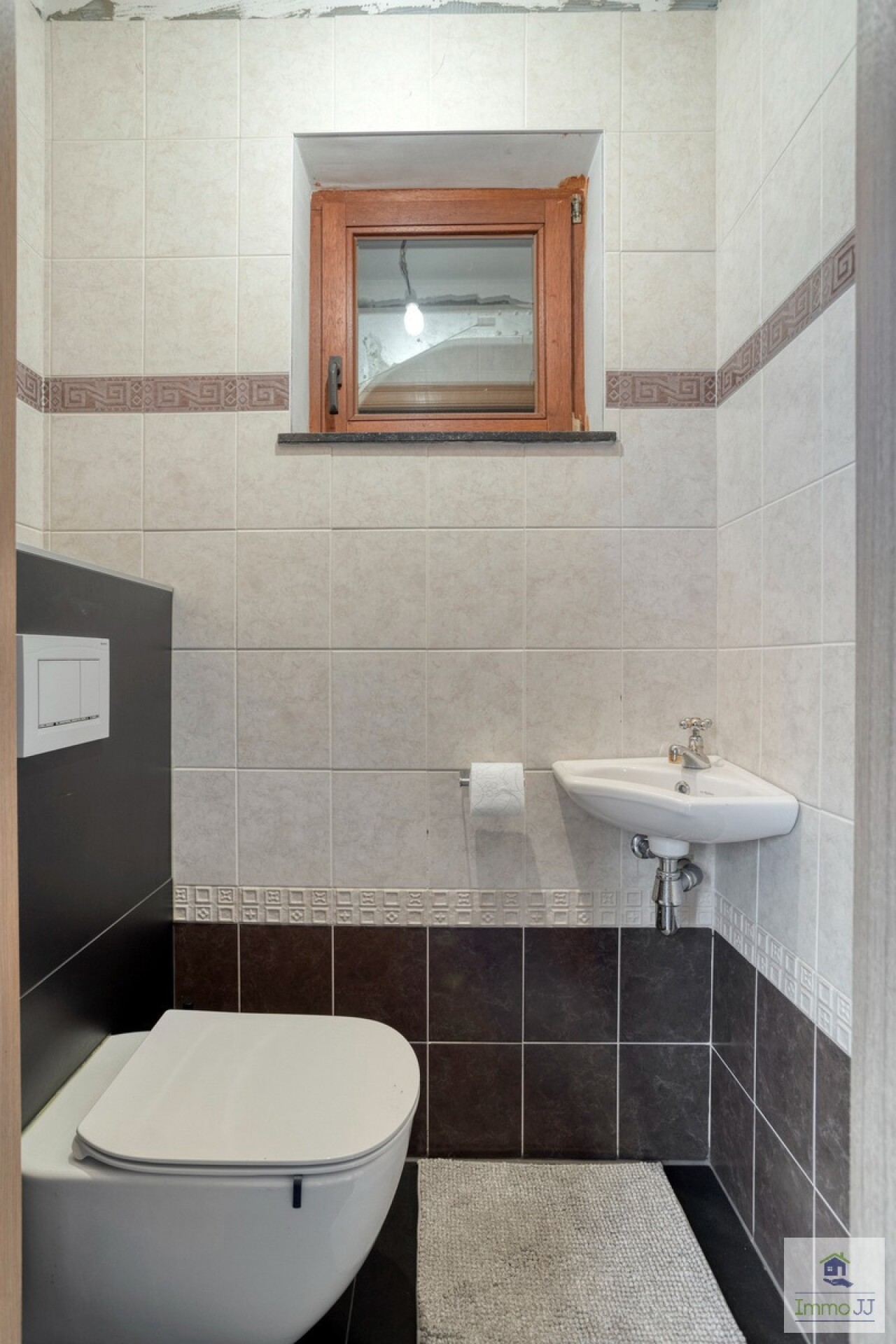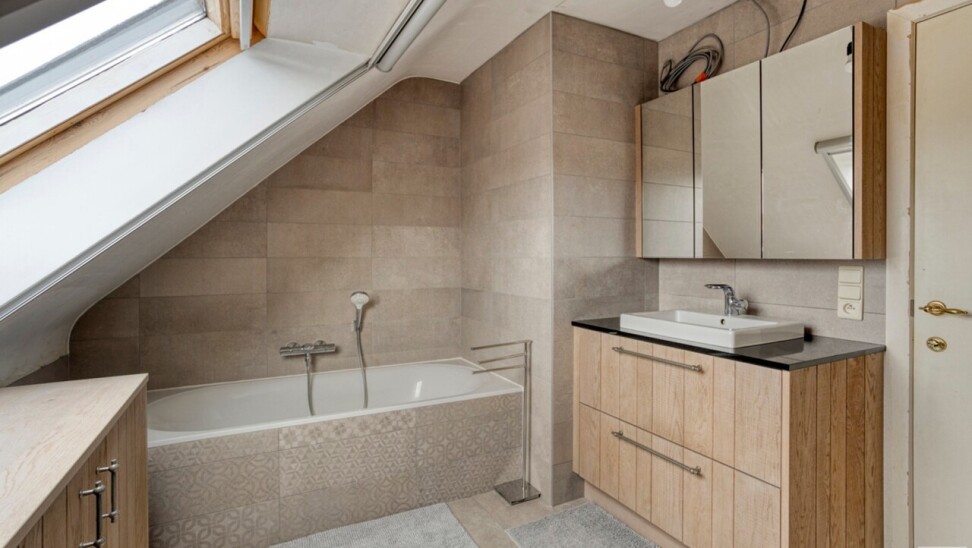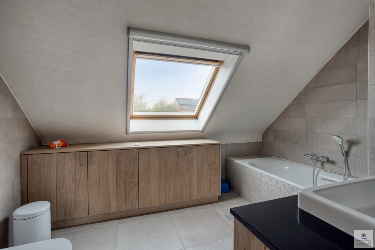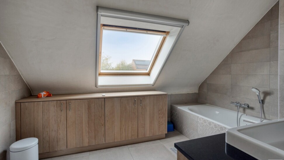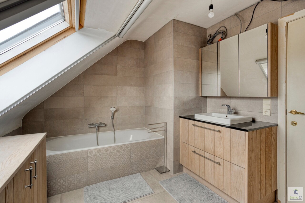+ volledig gerenoveerde badkamer met wc, enkel lavabomeubel en bad.